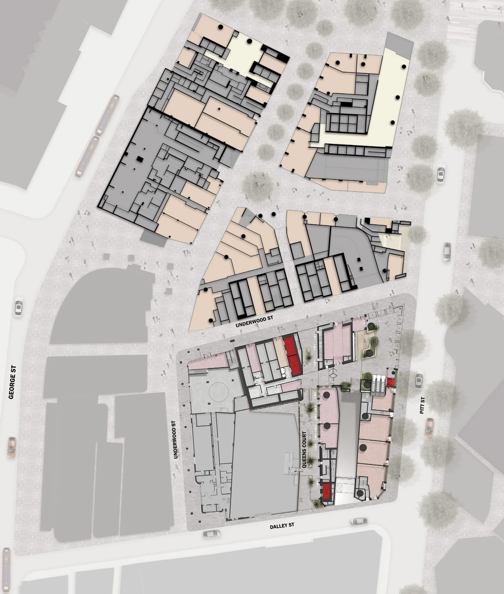With recognition to its heritage, the northern corner of Pitt and Underwood Streets opens to reveal a lush and warm landscape that invites the visitor into the grounds, creating a “cove” and providing a connection between city and coast. This Cove is a vibrant place — at its centre there is a symbolic water feature that mimics a tributary to the heritage stream beneath. The space will provide both daytime and night time activation to Pitt Street and the precinct through the means of increased connectivity, accessibility, and programmatic diversity.