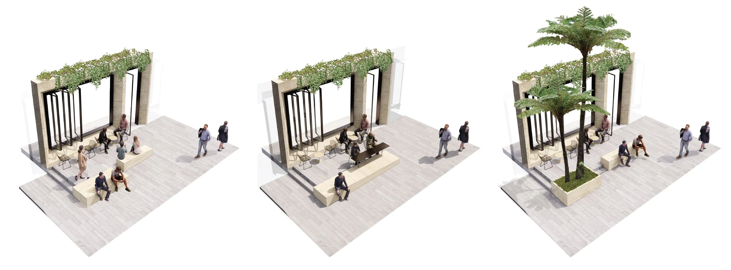 The entry water feature will provide a moment of calm and reflection to the space. The water will run down a textured face into a sandstone base mimicking the flow of water down the sandstone harbour ravines in Sydney. Trees will permeate throughout the site, housing themselves in large sandstone planters at varying levels through the ground plane and ascending to the level 1 lobby at the main entry forecourt. The trees will nestle, attach and merge into the natural materials in the same way biophilia burrows in and around the sandstone strata along the harbour edges.