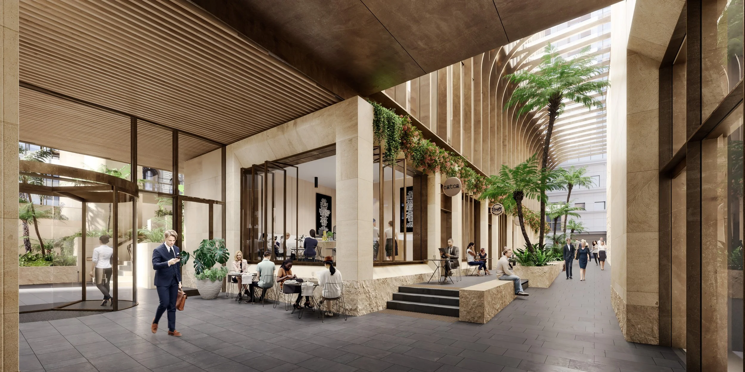 The vision for 55 Pitt Street is to create a sustainable, future focused, premium grade workplace that respects its place within the context of the City of Sydney. It will be an addition to the Sydney pedestrian experience and skyline that utilises natural materials and themes consistent with the history of the city and its original natural surrounds.