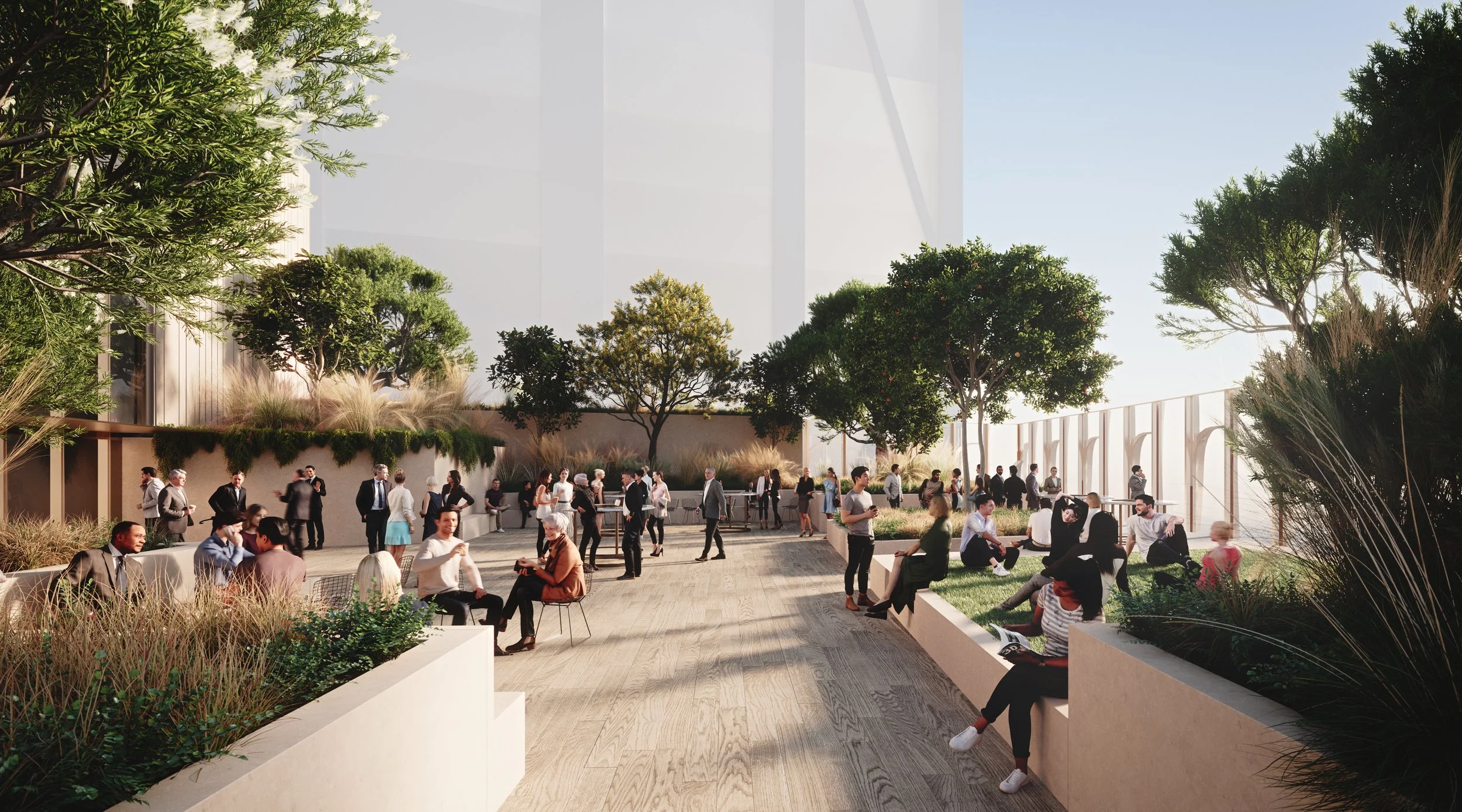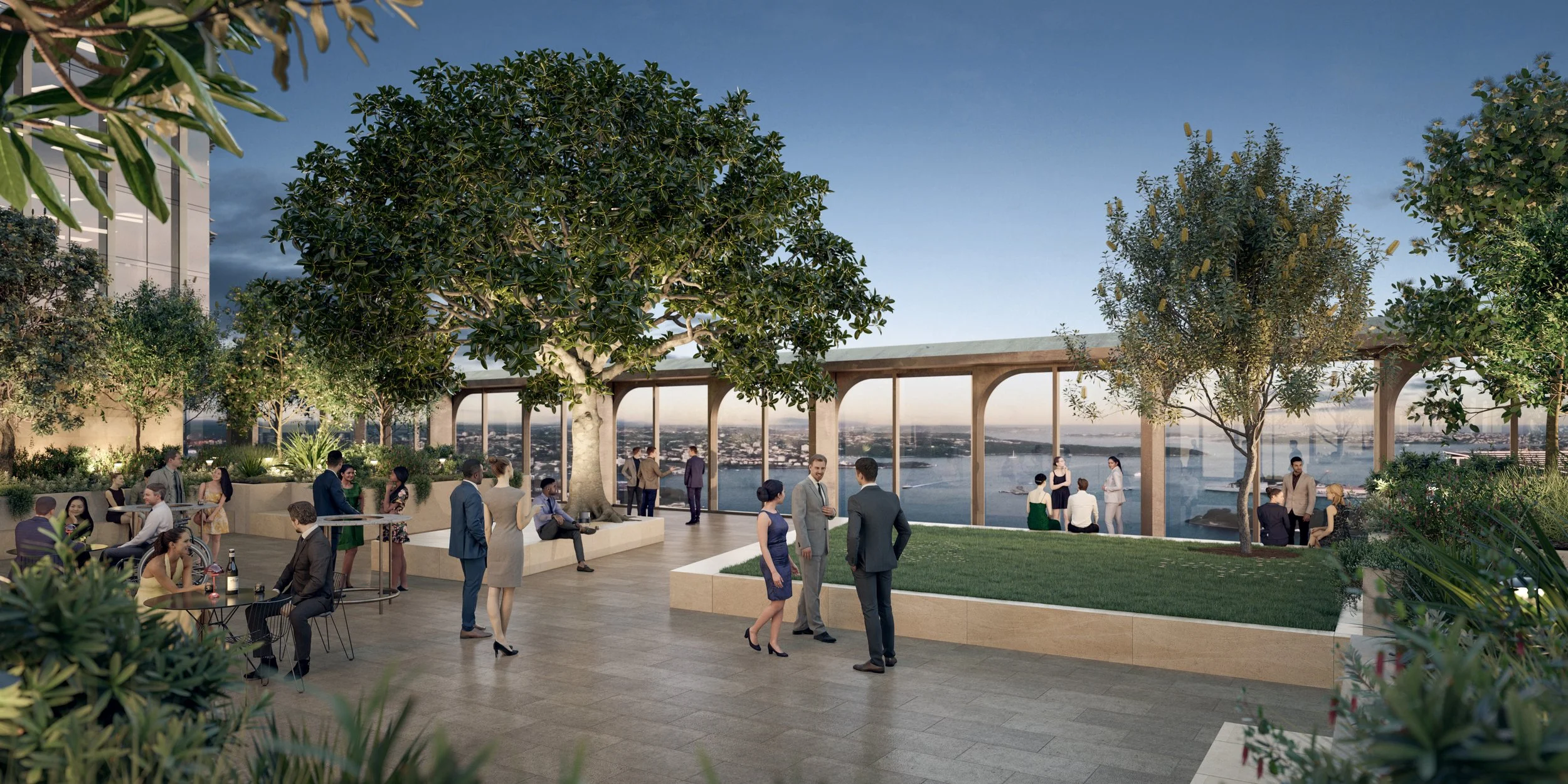 The rooftop terrace will be a significant component of the building’s amenity offering for tenants and has been designed to support multiple modes of activation. It has the ability to accommodate events and town hall style meetings required by tenants, it offers a respite and retreat opportunities in the garden and has designed to be truly accessible by all tenants. The design also emphasises harbour views to the east, has a material palette consistent with the building and references the philosophy introduced in the public domain on the ground floor. The southern portion of the terrace is the endangered species garden which incorporates intimate seating and informal meeting opportunities.